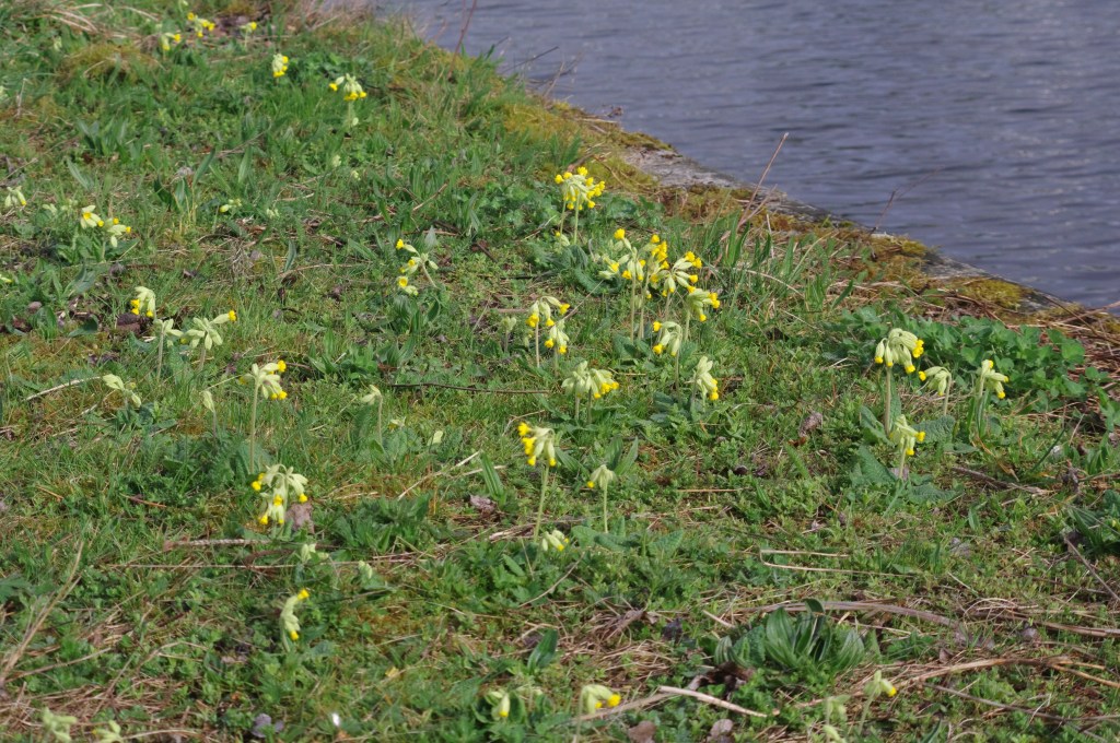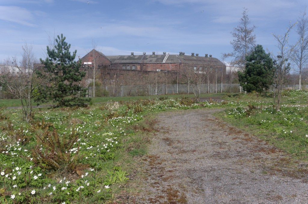 The “Jewels of North Glasgow” run heads past Pinkston Basin, taking in the Pear trees and the towpath Cowslips, which are now in bloom, crosses Pinkston Road and follows the railway cutting along the edge of the North Bridge estate, heading towards Fountainwell Road and Sighthill Cemetery. Wood Anemones here, planted beneath shrubs including a Corylopsis pauciflora and then more Cowslips.