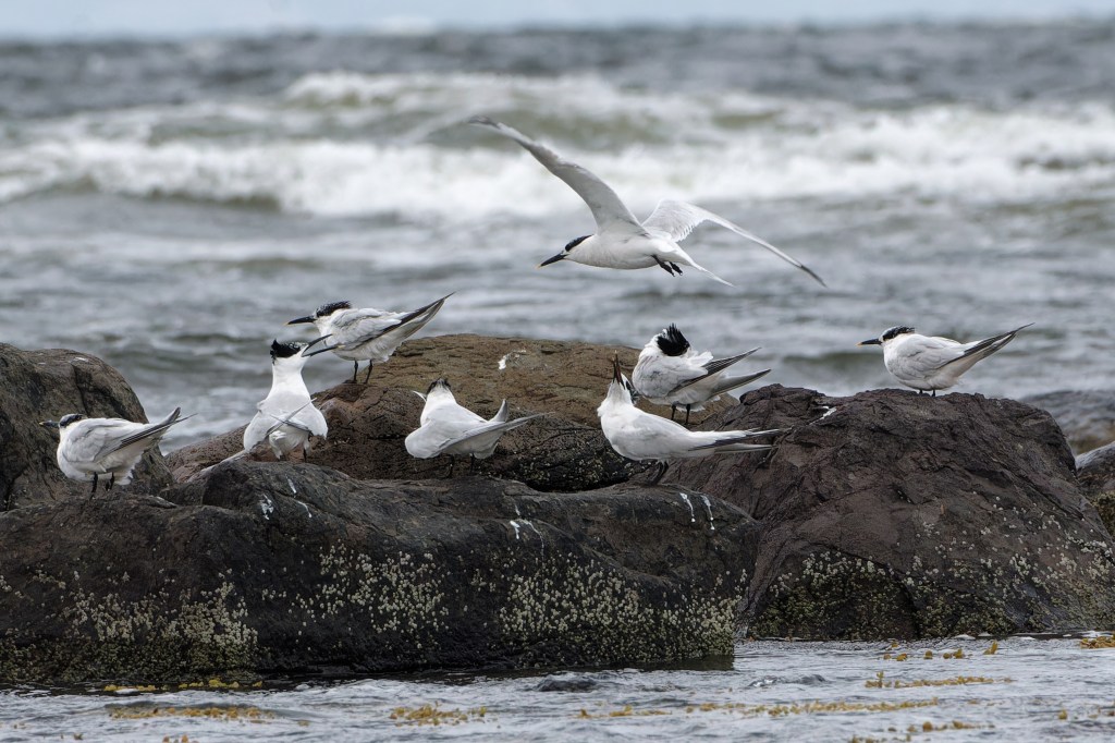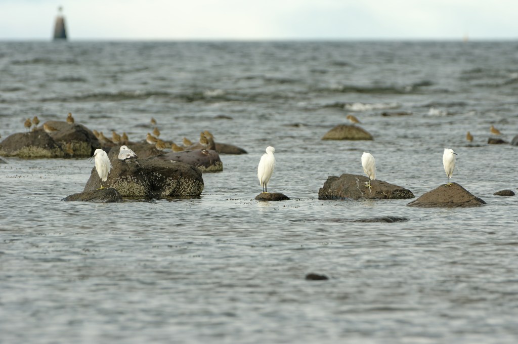 Many people engaged Backwoodsman in conversation that morning. All of them had a dog or three and all the animals were running wild. The humans were all excited because there were five Little Egrets on the Stinking Rocks. Backwoodsman had been watching the Egrets foraging as the tide rose but could only get a decent image of four of the five on the rocks.