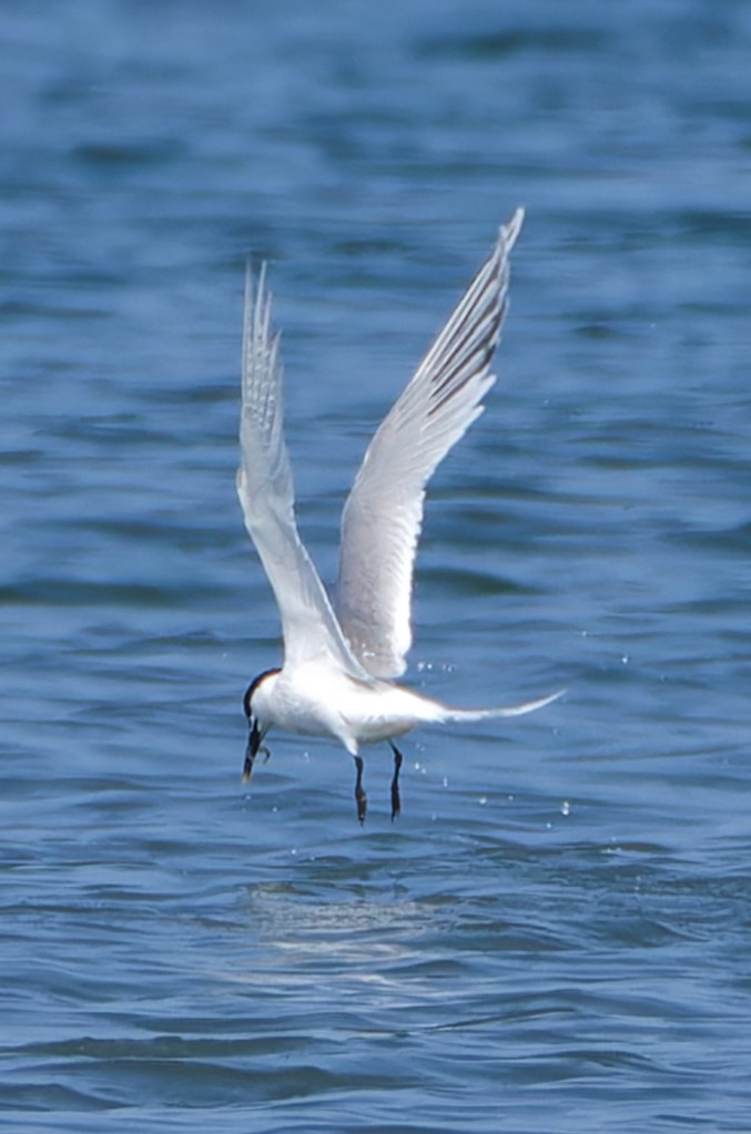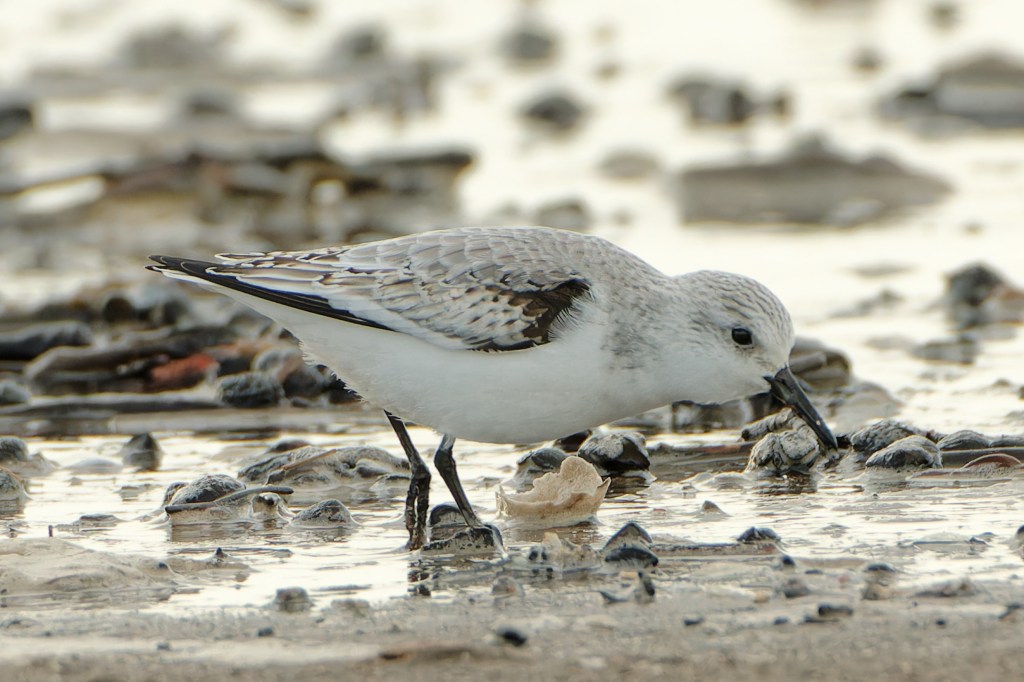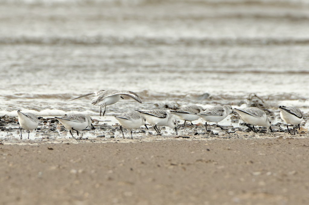 It was a big high tide and there was a small promontory of sand left exposed; all the small waders were at its edge with the Sanderlings being driven from left to right, and back again, by a man kicking a tennis ball for his dog. Backwoodsman took advantage of this disturbance by dropping to the sand and keeping very still. The Sanderlings came by, sometimes running, sometimes on the wing.