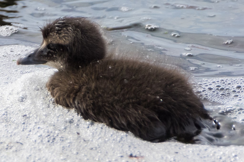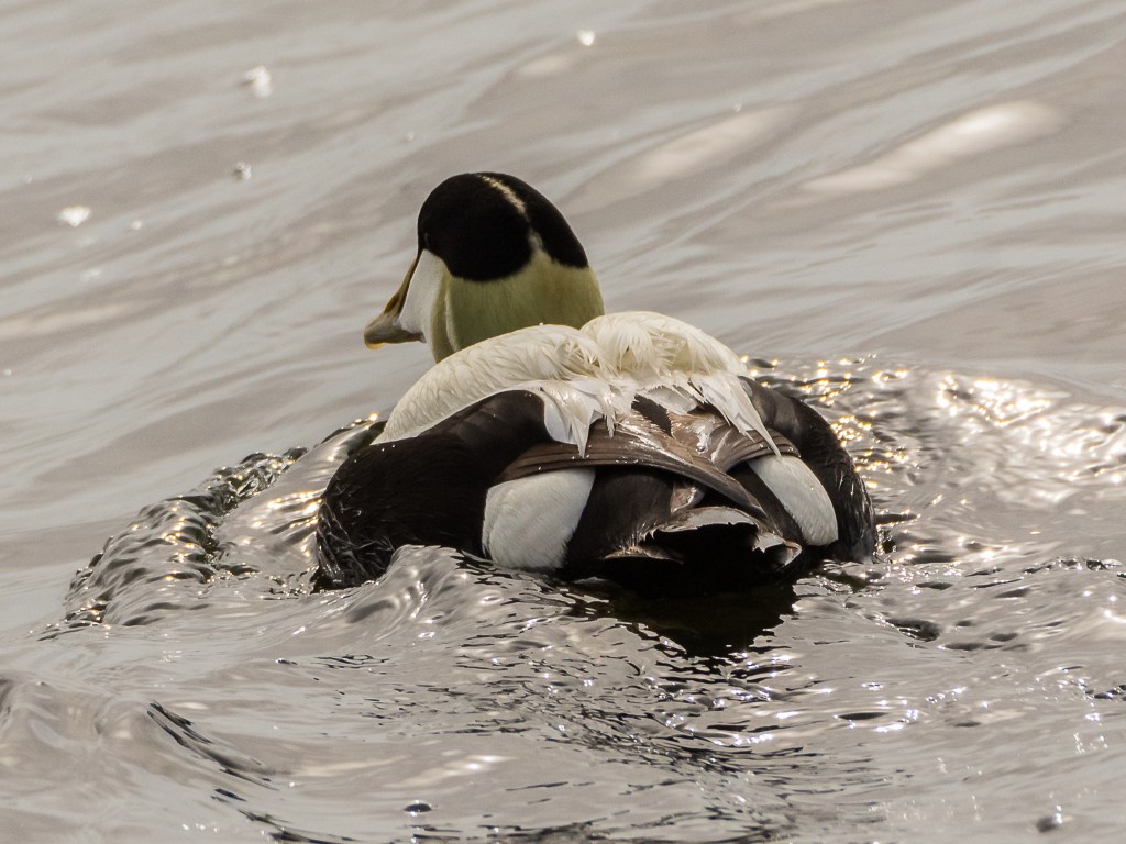 We could see up to ten drakes and one duck at a time; they would sail about and call, and then the whole group would dive. The colours looked vibrant in the excellent light, particularly that incongruous botanical green on the back of the neck.